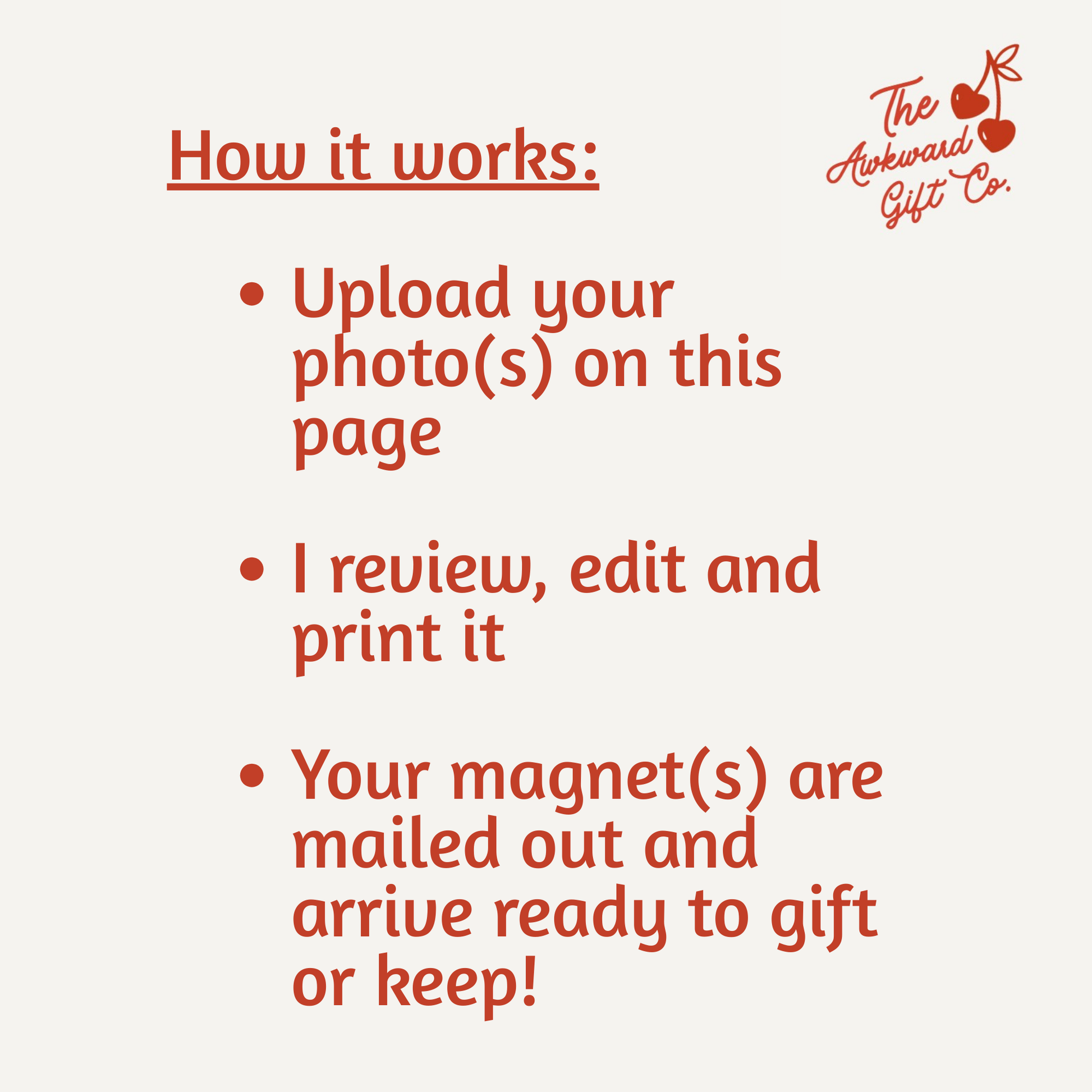 Ordering multiple magnets? Upload one photo per magnet. If you need more than 5, just leave a note at checkout and I’ll contact you. If you want multiple magnets of the same image, just upload one image!